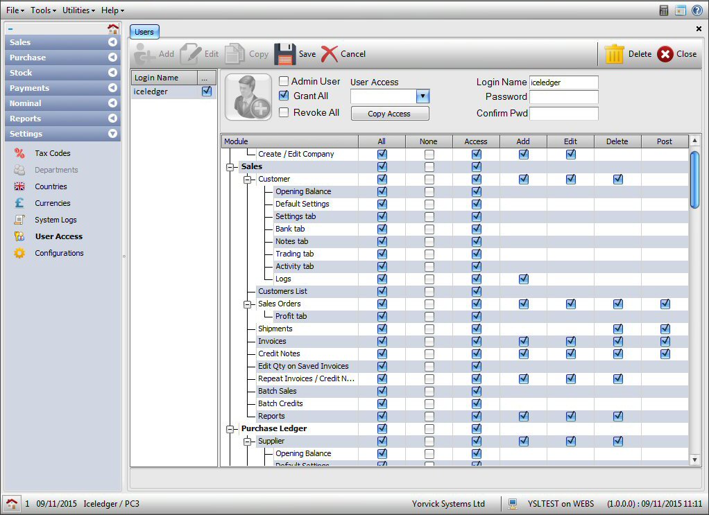 | Purchase | Purchase Ledger, suppliers and purchasing. | - Suppliers: Create / edit supplier account records.