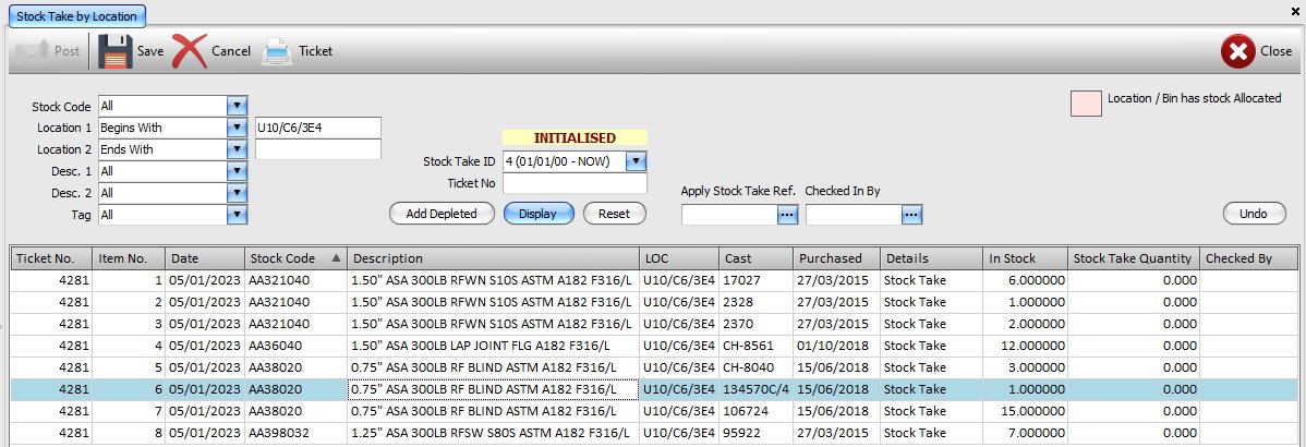 Stock TakeUse this button to display the Stock Take screen where you can reconcile actual stock levels with stock levels on the system.